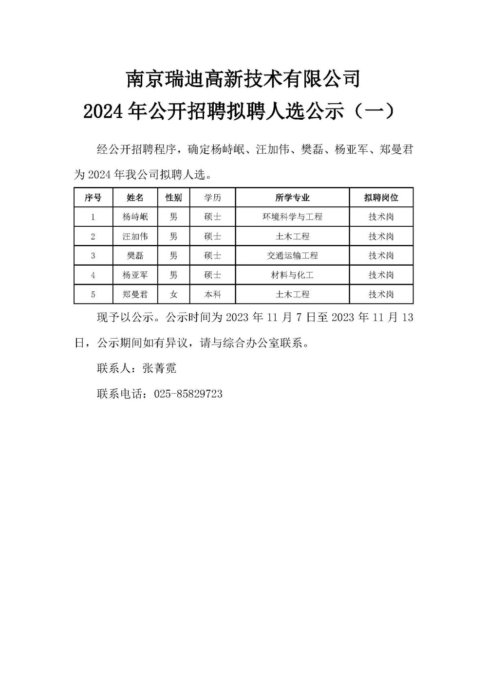 南京瑞迪高新技術(shù)有限公司2024年公開招聘擬聘人選公示(一)