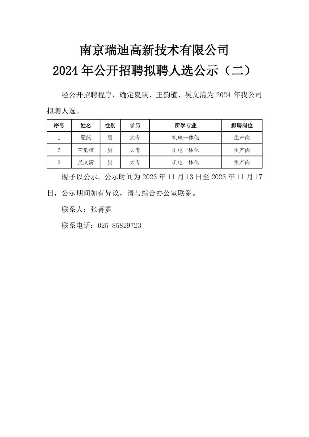 南京瑞迪高新技術(shù)有限公司2024年公開招聘擬聘人選公示(二)