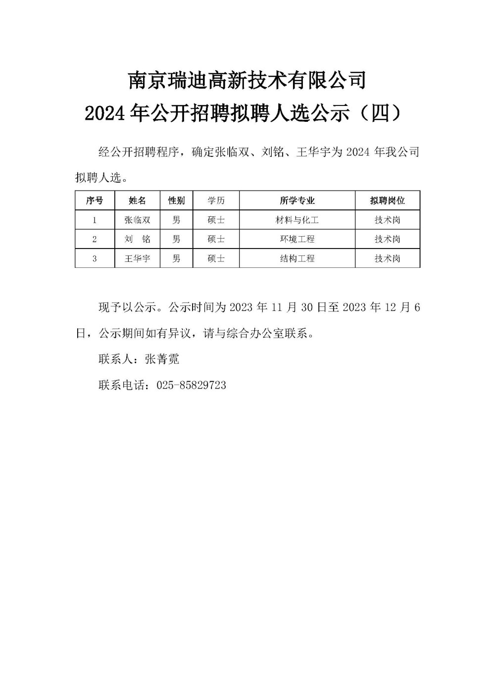 南京瑞迪高新技術(shù)有限公司2024年公開招聘擬聘人選公示(四)