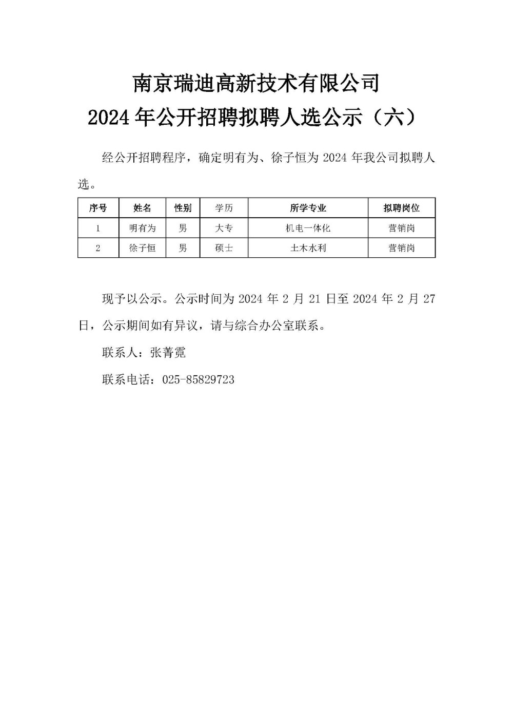 南京瑞迪高新技術(shù)有限公司2024年公開招聘擬聘人選公示(六)