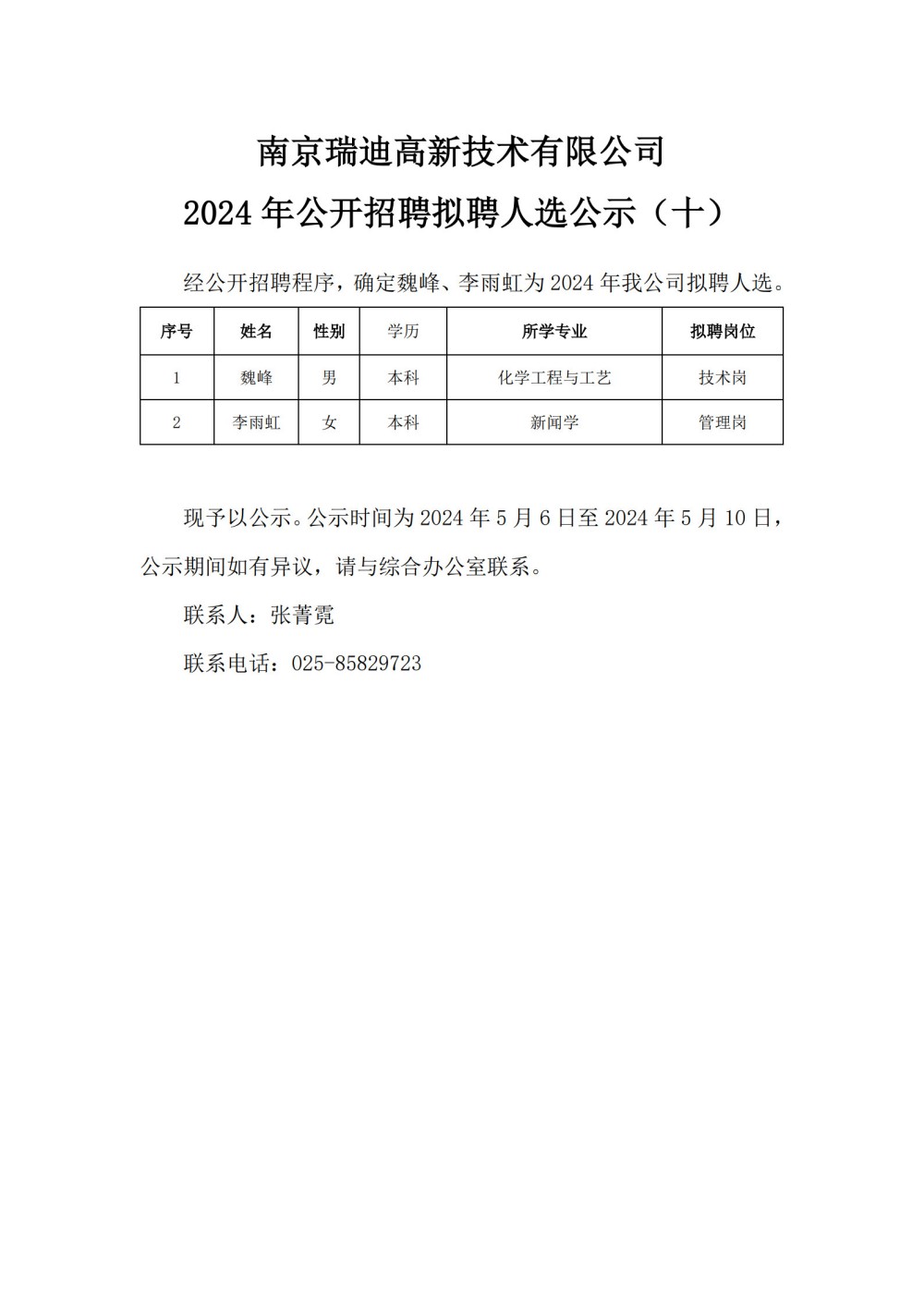 南京瑞迪高新技術有限公司2024年公開招聘擬聘人選公示(十)